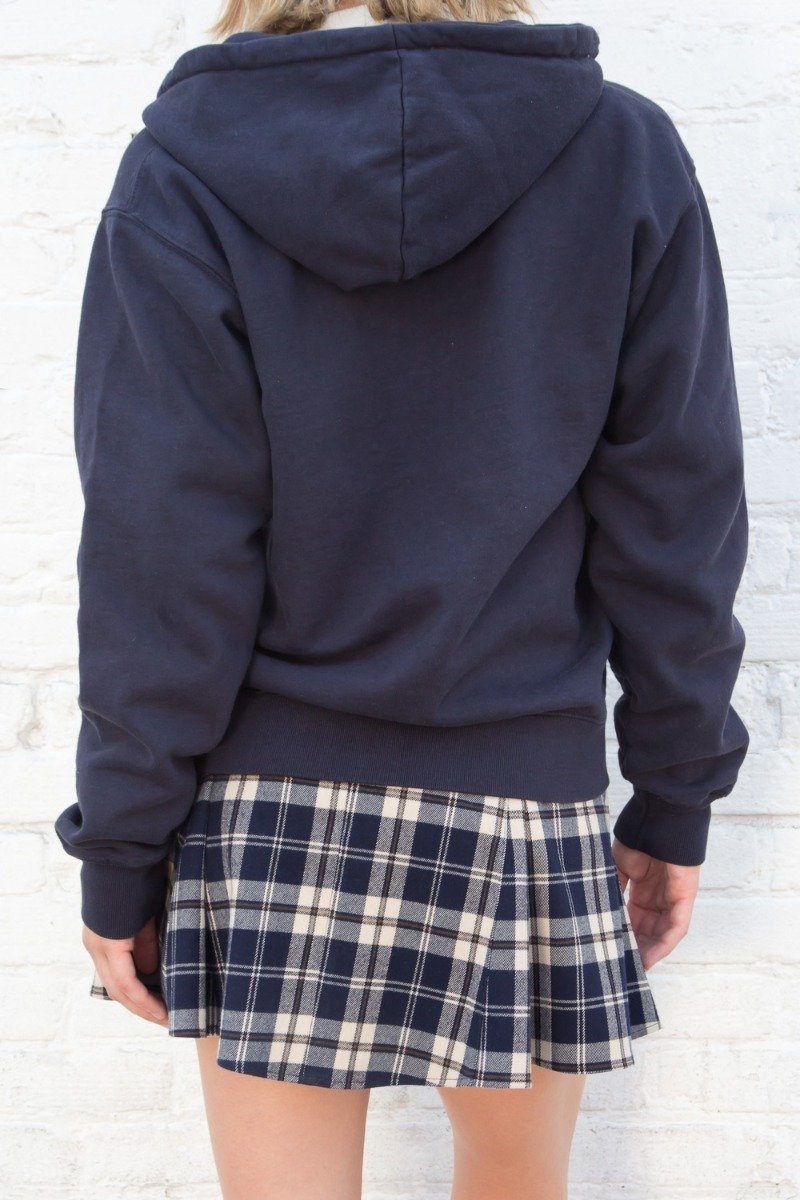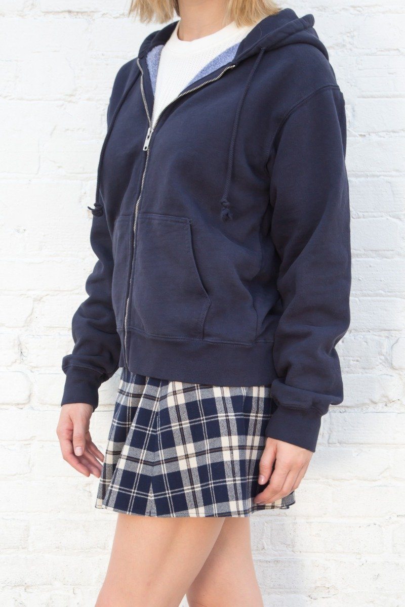 Cozy zip up hoodie in navy blue with two pockets and a drawstring hood.