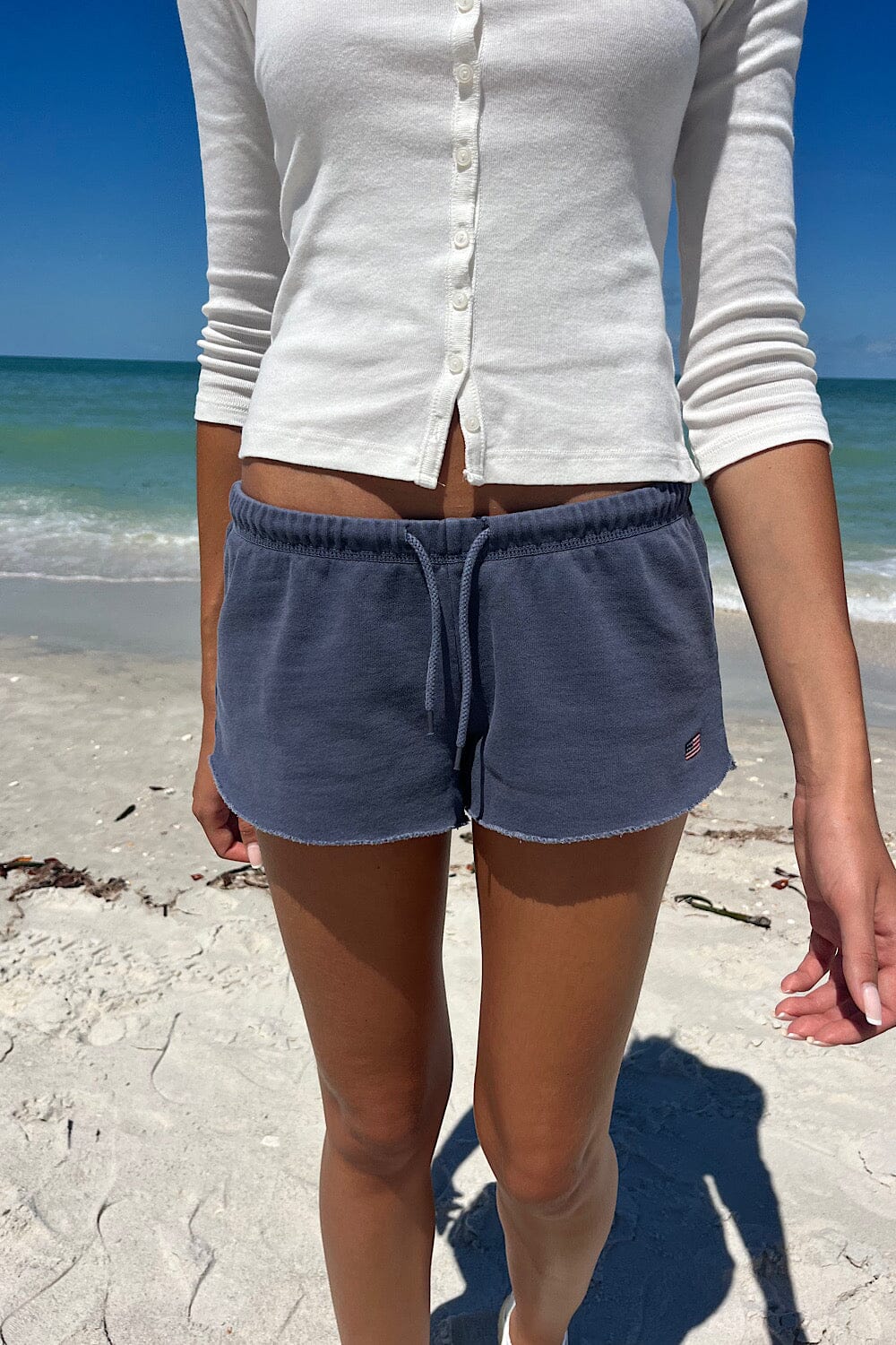 Soft faded blue shorts with a drawstring waistband, raw hem and a small embroidered American flag.