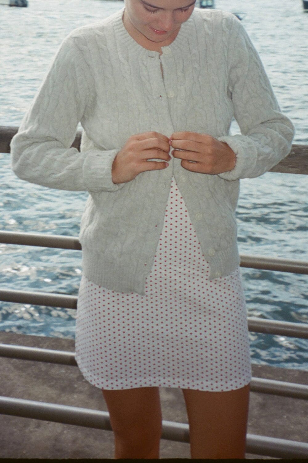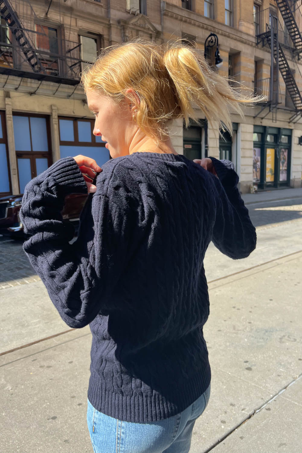 Classic, button-up, cardigan in a wool-blend, cable knit with ribbed trim.