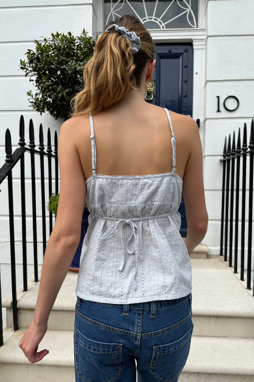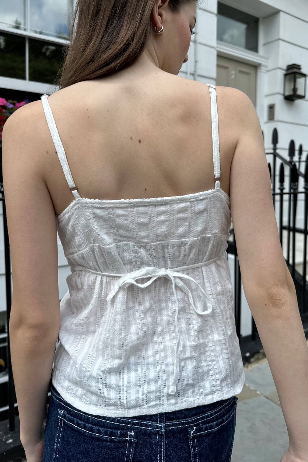 Flowy tank top with v-neck, pointelle details, adjustable straps and tie in the back
