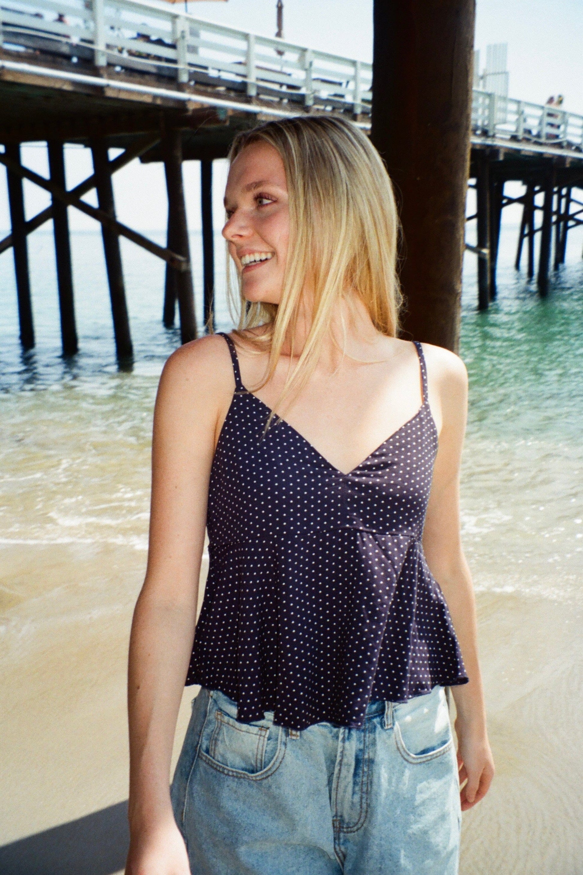 Flowy spaghetti strap blouse tank with white polka dots and a seem under the bust, and adjustable straps.