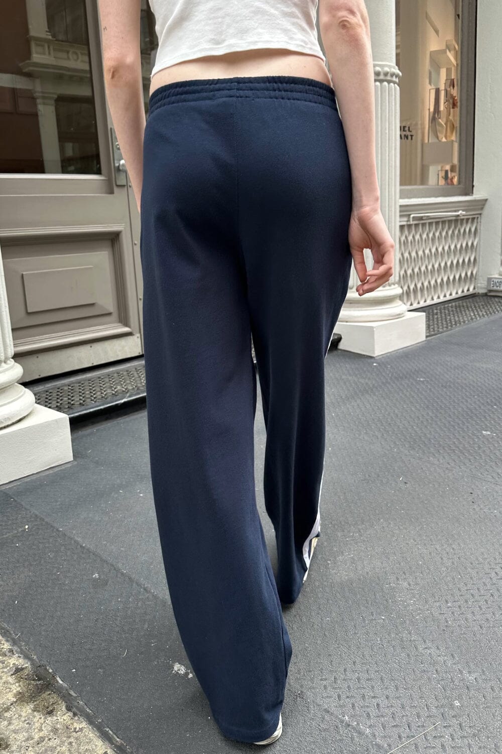 Thick and cozy cotton side stripe sweatpants with an elastic, tie waistband, white side stripe and side pockets.