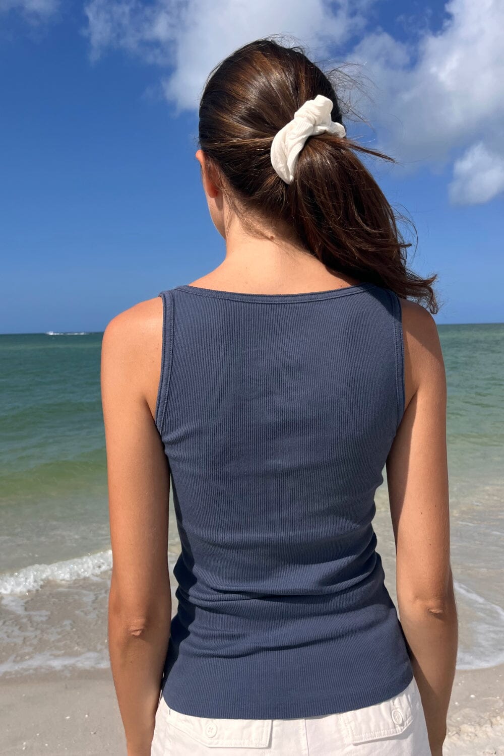 Soft ribbed cotton tank with a scoop neck and 4 buttons.