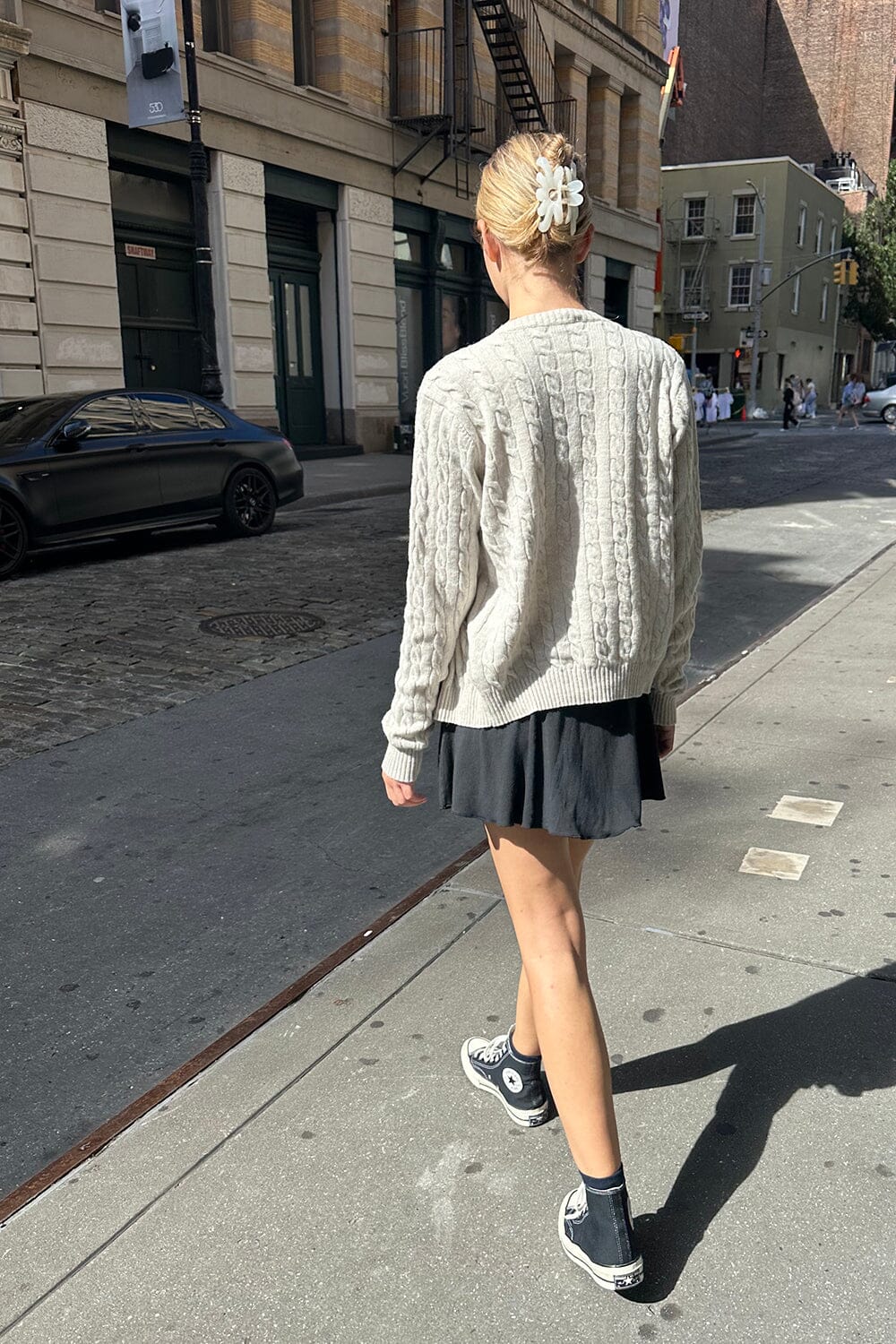 Classic, button-up, cardigan in a wool-blend, cable knit with ribbed trim.